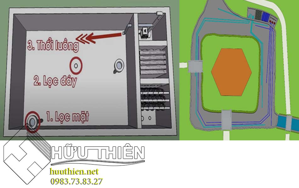 Đầu thổi luồng: bao gồm thổi đáy, thổi giữa và thổi mặt. Nhiệm vụ luân chuyển nguồn nước trong hồ, đẩy cặn đáy về lổ thu đáy, rác bề mặt về phiểu hút mặt… Đầu thổi luồng được bố trí cặp theo thành hồ, cao thấp tùy theo hồ.