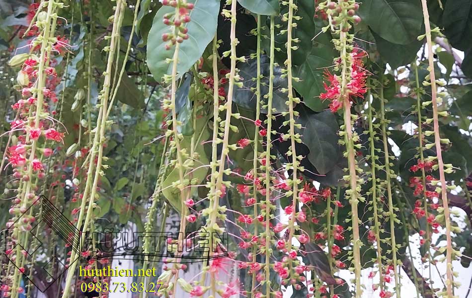 Hoa nhỏ, kết thành chuỗi rủ xuống, dài từ 6 – 20cm, màu đỏ thắm, có hương thơm nhẹ. Cây ra hoa mỗi năm 2 lần, khoảng vào tháng 5 – 6 và tháng 10 – 11 âm lịch.