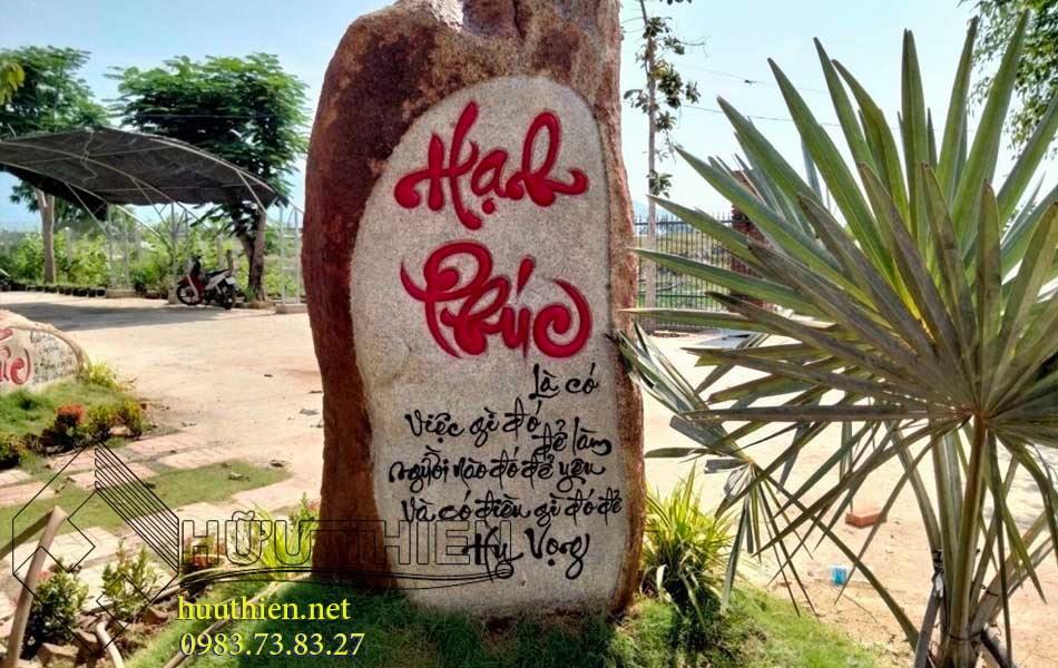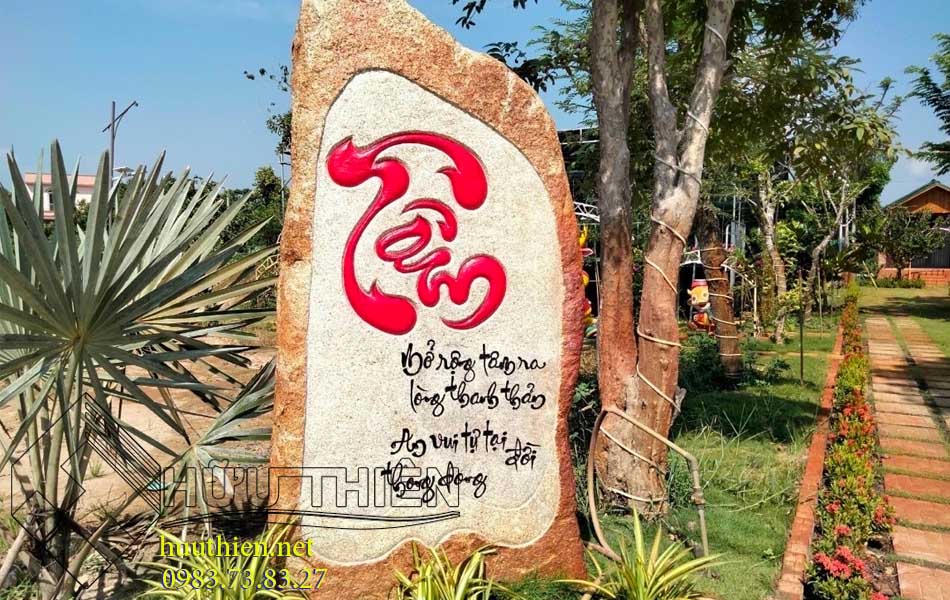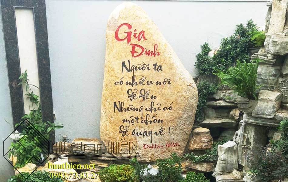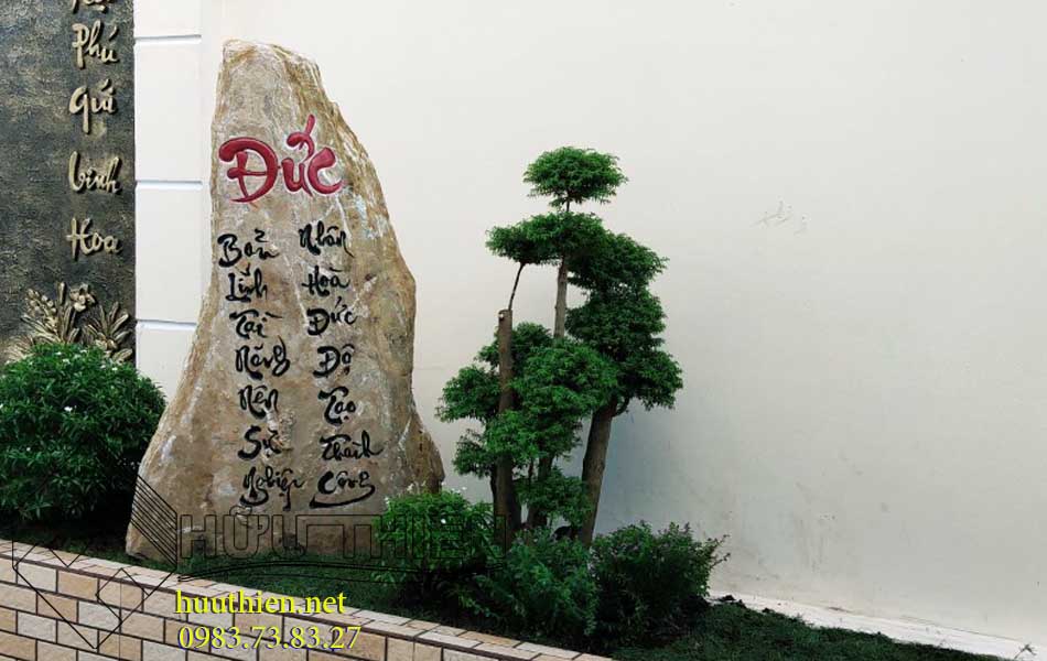 Vui lòng liên hệ với công ty Hữu Thiên theo số điện thoại / zalo 0983.73.83.27 để được tư vấn. Thiết kế cảnh quan sân vườn với những tảng đá khắc chữ đẹp. Mang đến sự hài hòa với sân vườn và phong thủy.