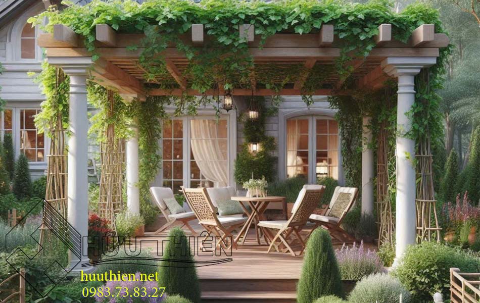 Sử dụng giàn che Pergola là một lựa chọn phù hợp cho sân vườn trước nhà. Giàn che Pergola vừa có tác dụng che bớt ánh sáng. Ngoài ra, giàn che còn tô điểm cho ngôi nhà, tạo mảng xanh từ các cây dây leo.