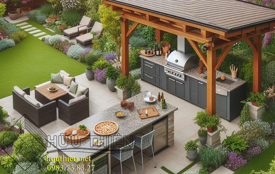 Tăng cường hoạt động ngoài trời là xu hướng phổ biến hiện nay. Thật thú vị khi trong sân vườn có một khu vực dành cho bếp, nơi mà mọi người cùng nhau quay quần chuẩn bị và thưởng thức tiệc nướng ngoài trời. Điều này giúp mọi người dành nhiều thời gian tiếp xúc với không khí bên ngoài và gắn kết tình cảm của các thành viên trong gia đình. Bếp ngoài trời đơn giản chỉ cần bao gồm bồn rửa, bếp củi, lò nướng, cũng đủ làm khu vực sân vườn trở nên ấm áp.