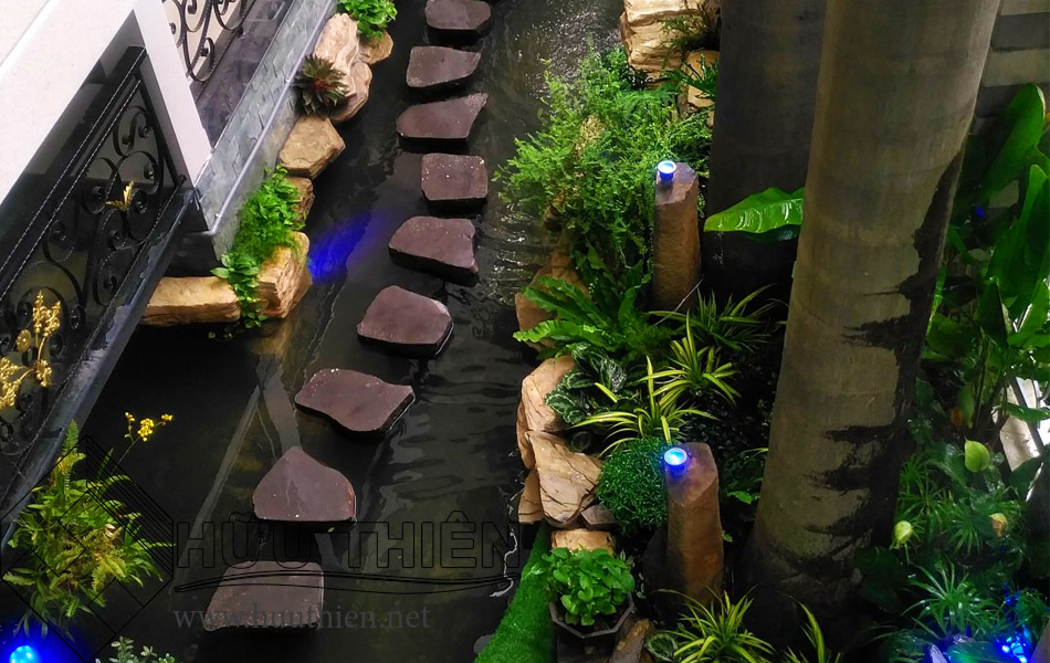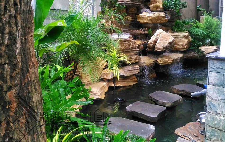 Thiết kế thác nước hồ cá Koi với những phiến đá bước dặm là một trong những cách thiết kế sân vườn hiệu quả. Biến những lối đi quanh nhà ngoài trời với diện tích hạn chế thành sân vườn đẹp và đầy sinh khí. Gây ấn tượng cho quan khách ngay từ bước chân đầu tiên khi tiến vào khuôn viên. Dưới đây là một trong những mẫu thiết kế thi công sân vườn đẹp. Sân vườn này được công ty Hữu Thiên đã thực hiện cho một quán café tại quận Tân Bình.