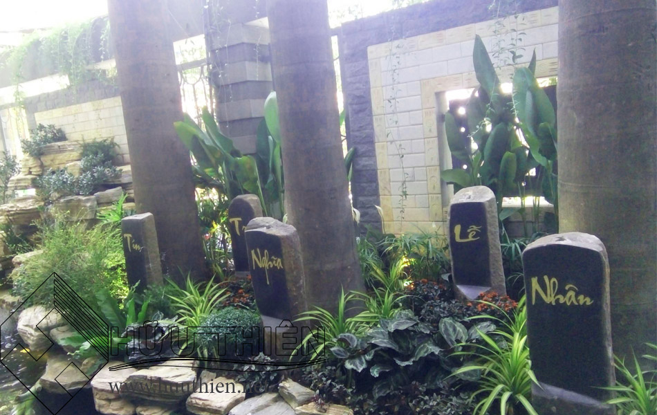 Những tảng đá khắc chữ “Nhân” “Lễ” “Nghĩa” “Trí” “Tín” được đặt khéo léo dưới hàng 3 cây cau vua theo tâm ý của chủ đầu tư. Cho dù cuộc sống có hối hả, mọi người có bận rộn thế nào, thì đừng quên lời dạy của Khổng Tử – người sáng lập Nho giáo, về Tam cương Ngũ thường, điều đã trở thành chuẩn mực về đạo đức được lưu truyền qua hàng trăm năm. Những điều đã quen thuộc với đời sống tinh thần của con người Việt Nam, đó là nhân hậu, lễ giáo, chính nghĩa, trí tuệ, uy tín. Dựa theo đó, mối quan hệ giữa người với người sẽ được bền vững, tránh được những sự xấu xa, tai ương trong cuộc đời, từ đó xã hội được an bình, hạnh phúc.