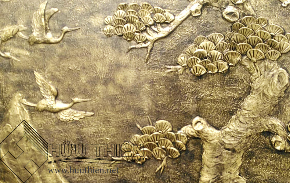 Tranh tường phù điêu giả đồng được nghệ nhân thực hiện với giá trị thẩm mỹ cao. Loại tranh này giúp tăng tính nghệ thuật cho không gian. Cây tùng với tư thế đón khách, thể hiện sự tiếp đón nồng hậu, chân tình. Ngoài ra, tùng và hạc đều có tuổi thọ cao, mang ý nghĩa cho sự trường thọ và thịnh vượng.